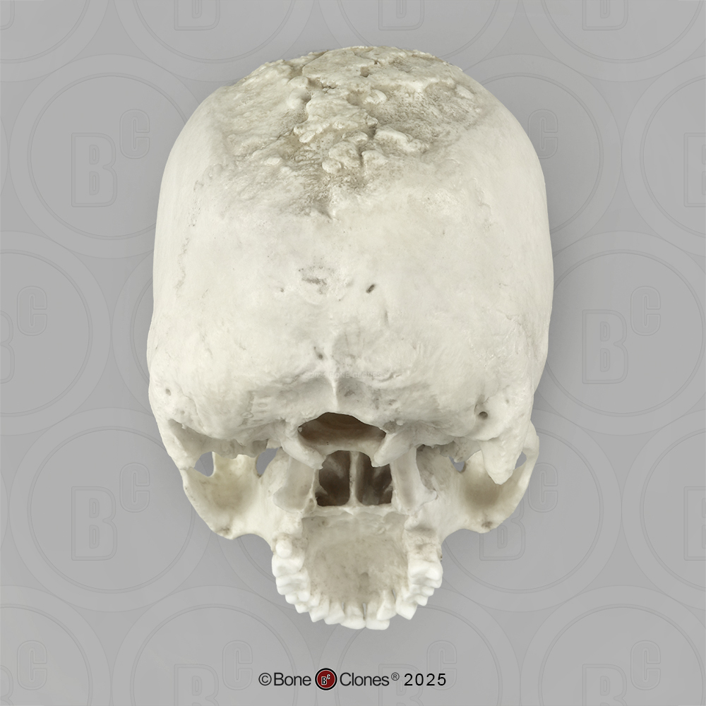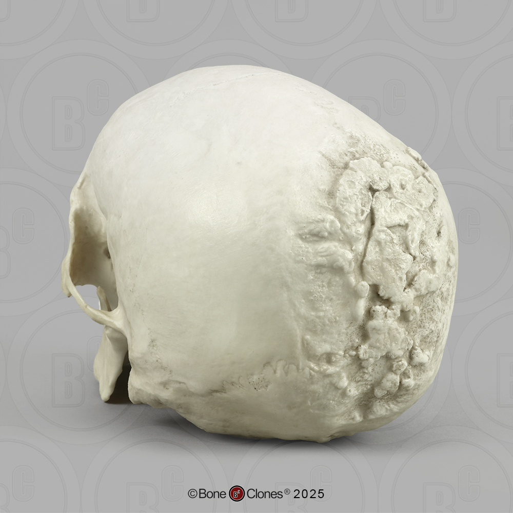 Syphilis is a bacterial infectious disease which has a venereal mode of transmission. As seen here, tertiary syphilis results in numerous lesions on the skull vault. Presentation of caries sicca on the parietal bones and occipital can be seen when the person is severely affected and in this case, there is advanced sclerotic healing. Syphilitic lesions often affect the outer table of the skull, leaving the inner table spared.